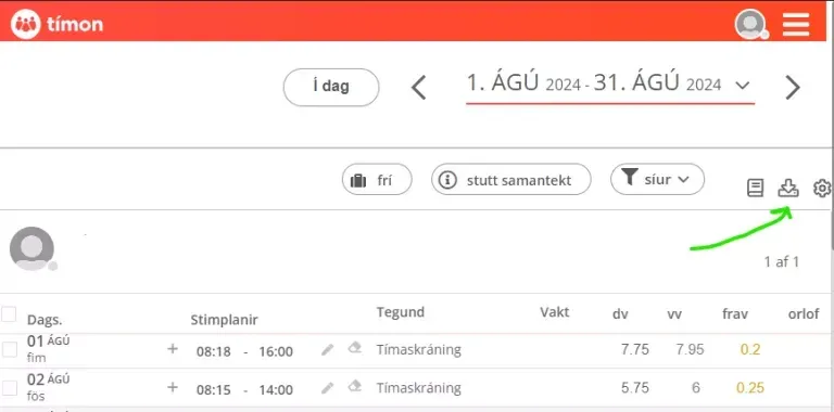 - Ef tímaskráningar hjá atvinnurekanda eru í gegnum Tímon þá er best fara inn á notendaaðganginn þinn þar og hala niður tímaskýrslunni sem Excel